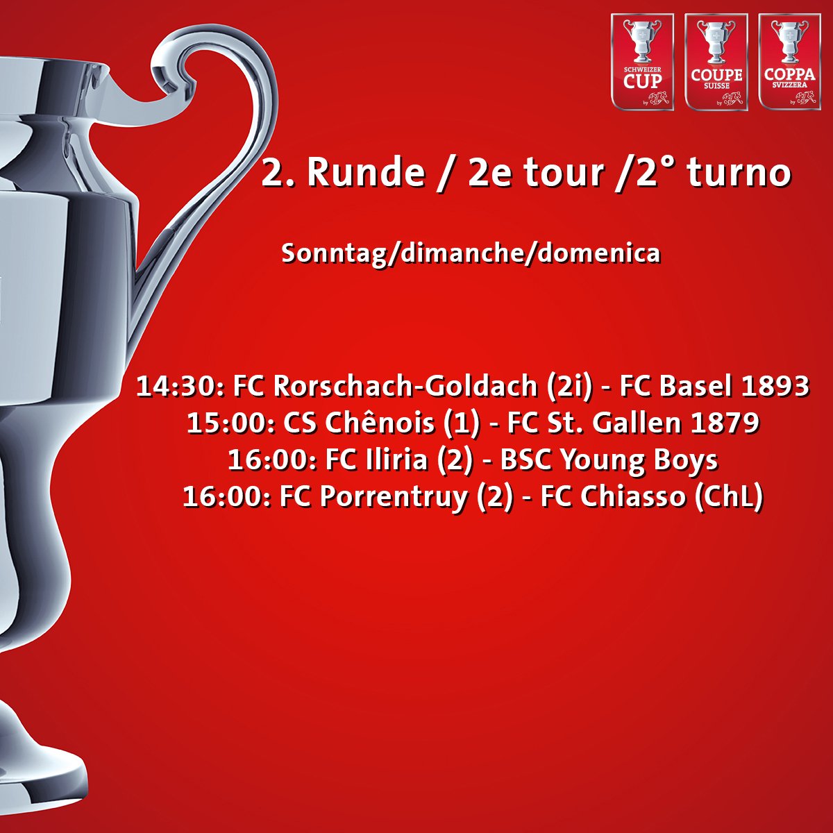 Tous les résultats du jour Coppa Svizzera 202122. Das sind die Paarungen Im Anschluss an das letzte Achtelfinalspiel zwischen Lausanne-Sport und Xamax das mit einem 60-Kantersieg und einem Traumtor für den Unterklassigen endete wurden die Paarungen für die Viertelfinals des Helvetia Schweizer Cups ausgelost. Schweizer Cup Livestream Konferenz Der Runde 2 herzlich willkommen bei der schweizer cup runde 2 livestream konferenz der saison 21 22.